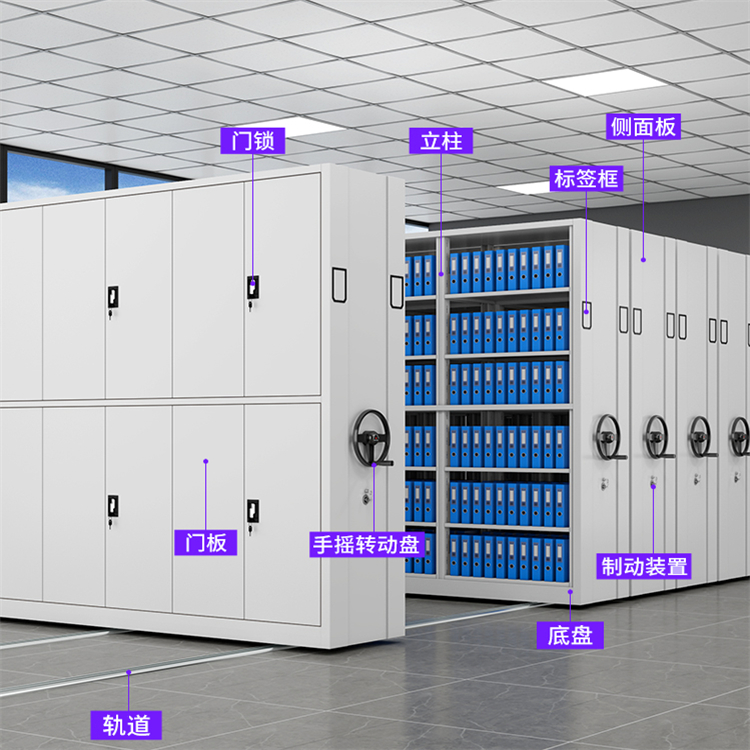 手动密集架主要用于提案、图书或物品的存储密度,节省空间,同时保持有序管理。具体用途包括: 1. 档案管理 适用于机关、企业、学校的档案室,集中存放大量档案资料,通过手动移动架体,快速访问所需档案,避免分散柜体的空间浪费。 2. 图书馆存储 用于图书馆的书库或后备藏书区,紧凑排列书籍,减少通道占用面积,尤其适合低频使用但需长期保存的文献。 3. 仓储管理 在仓库或资料室中存放文件、样本、工具等物品,通过密集排列提升单位面积存储量,适合空间有限的场所。 4. 财务凭证存放 企业或机构用于保存会计凭证、合同等纸质材料,密集结构增强安全性,便于分类管理。 5. 博物馆与展览馆 存储展品备份、文献或小型,节省存储空间,同时通过架体移动实现灵活取用。 6. 办公室资料整理 集中管理办公文件、项目资料,避免传统文件柜的零散布局,提升空间利用率。 手动密集架通过轨道滑动设计,在需要时移动架体形成通道,无需为每个柜子预留开门空间,特别适合大量实体资料的集约化存储。